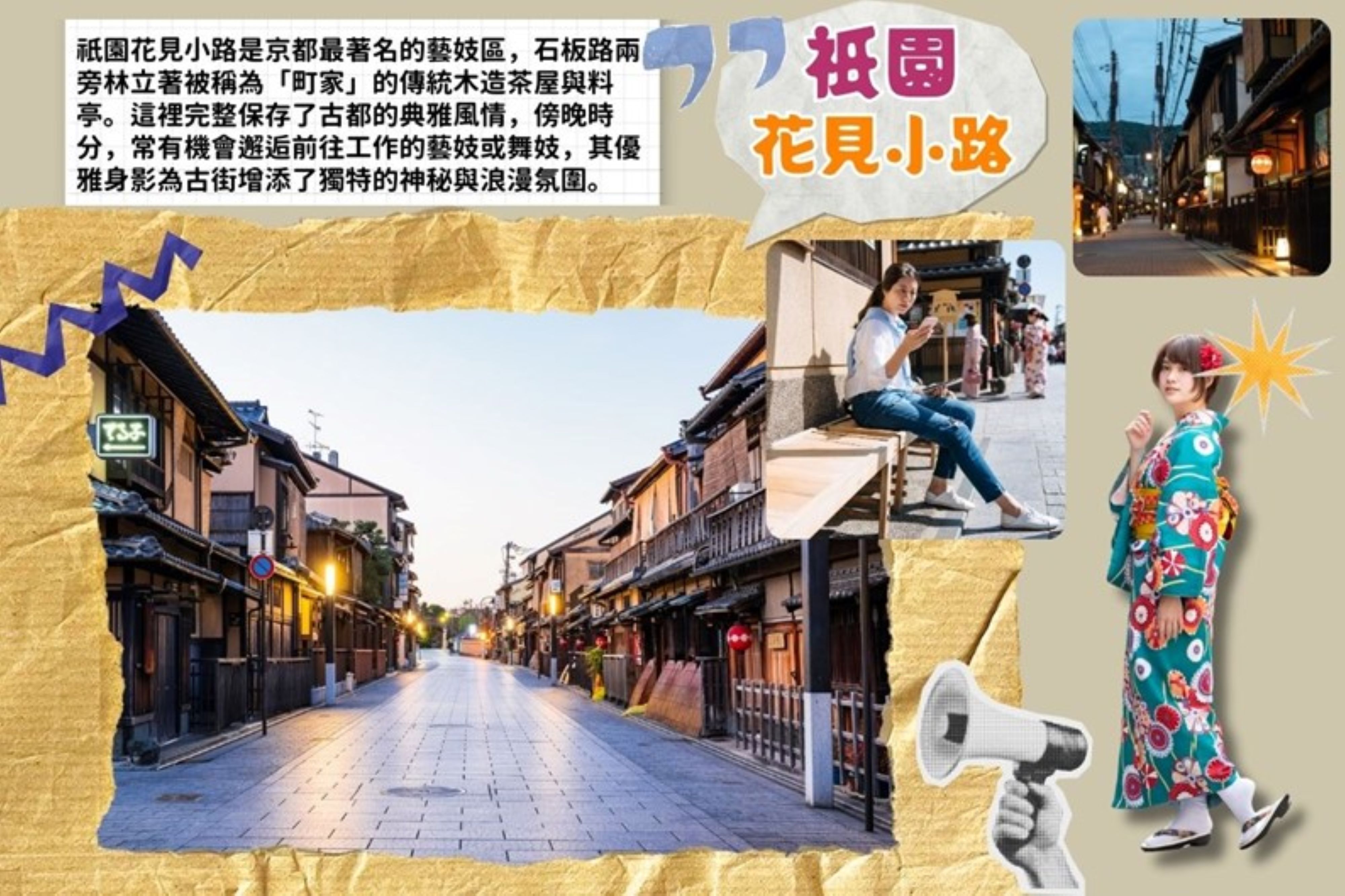 【祇園花見小路】京都最具代表性的古風街道之一,保存完整的町家建築與石板路,夜晚點燈後別具風情。若幸運,還可巧遇穿著華麗和服的舞妓,是最能代表京都藝伎文化的街區。