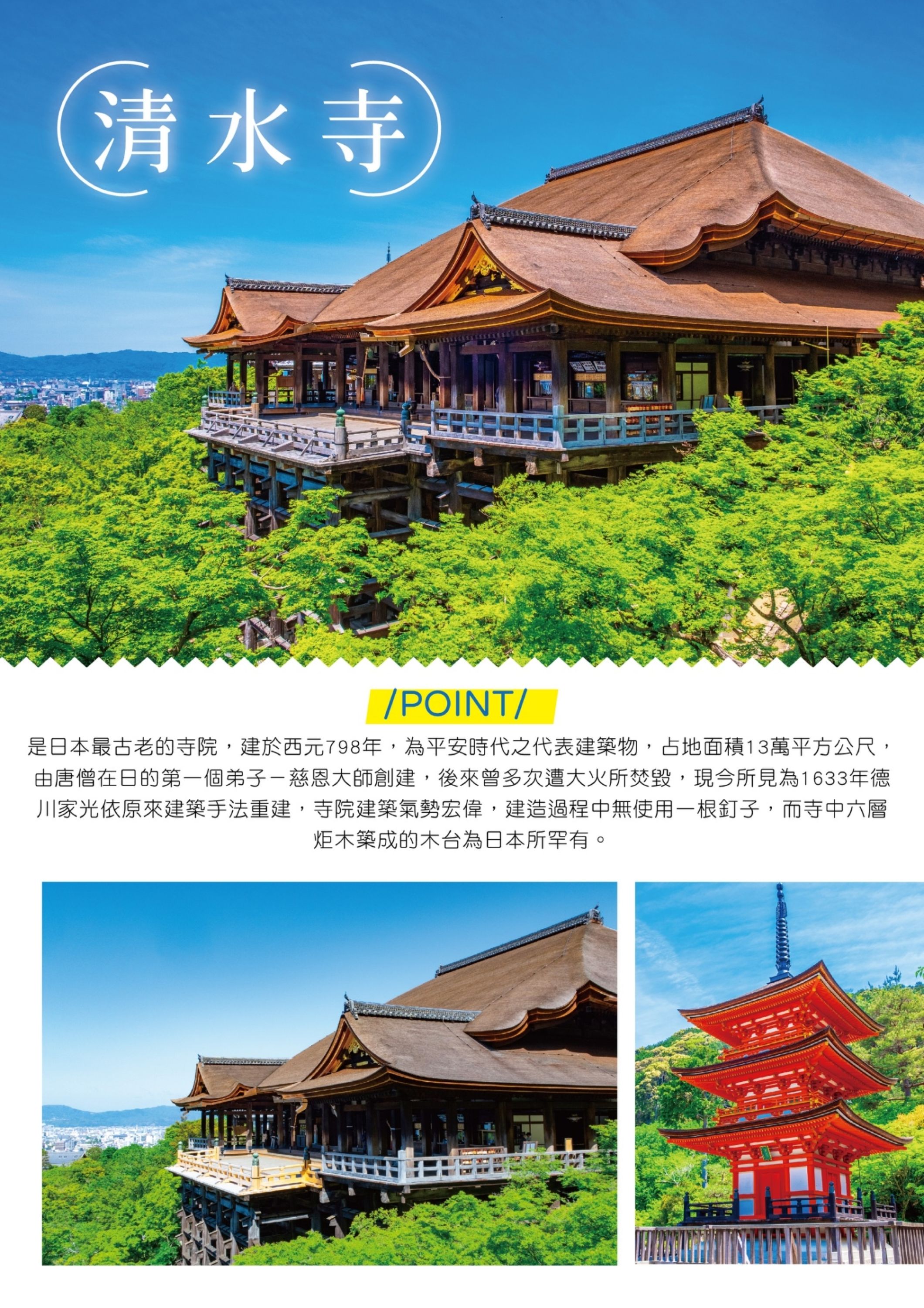 【世界遺產~清水寺入內參觀】坐落在京都市東山區的音羽山清水寺建於西元778年(寶龜9年),主要祭祀觀音。不只名列世界文化遺產之一,本堂更被指定為日本國寶,堂前的清水舞台也甚具特色,境內還有許多五重塔等日本指定文化財,而受自然花卉植栽擁簇,四季景觀亦相當秀麗,尤以春櫻、秋楓備受關注,讓這裡和金閣寺、嵐山同列京都最知名的觀光名勝。擁有悠久歷史的清水寺,位處京都的音羽山,寺院依地勢築建,占地遼闊,受自然景觀所包覆,寺門、堂院、塔樓掩映其中。清水寺主要建築為供奉著千手觀音的本堂,本堂前有處以檜木搭成的「舞台」,它只由139根高數十米的大圓木支撐,未用一根釘子建成,巧妙地聳立於陡峭懸崖上,時常出現於日本歷史與俗語中,是清水寺內最具代表性的代表風景。
