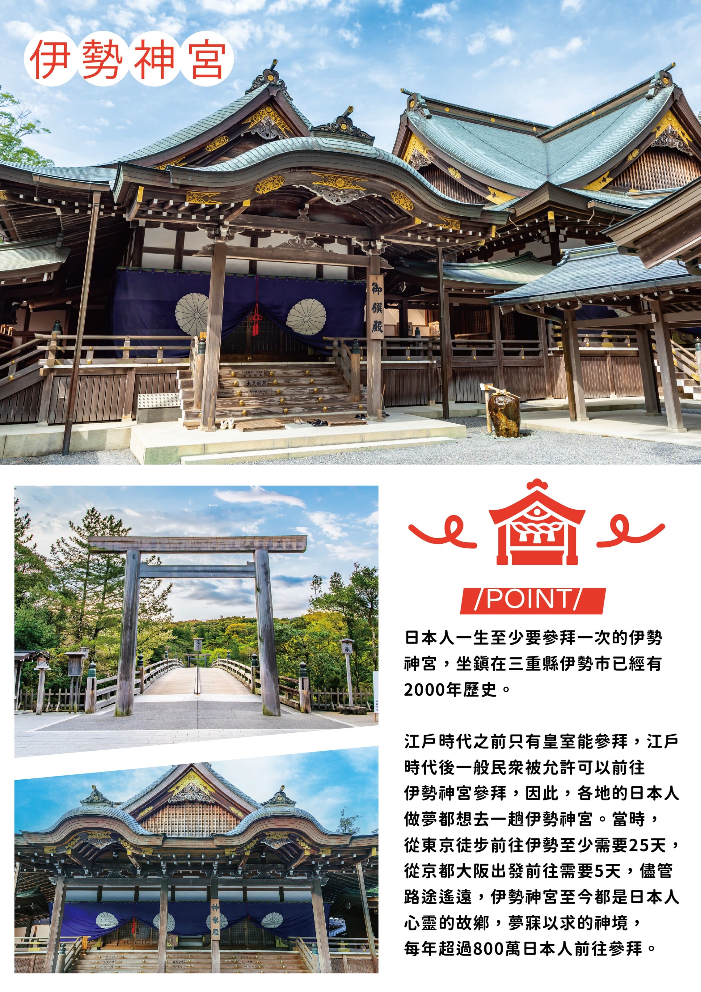【伊勢神宮】擁有二千年悠久歷史;日本三大神宮之一,傳說神宮是日本萬神之神─天照大神的居所,是擁有千年以上歷史的日本神聖之地,寺中象徵日本皇室家族三種標誌的鏡子,是日本天皇登基後必來朝拜的地方,自江戶時期起,允許一般庶民參拜。
