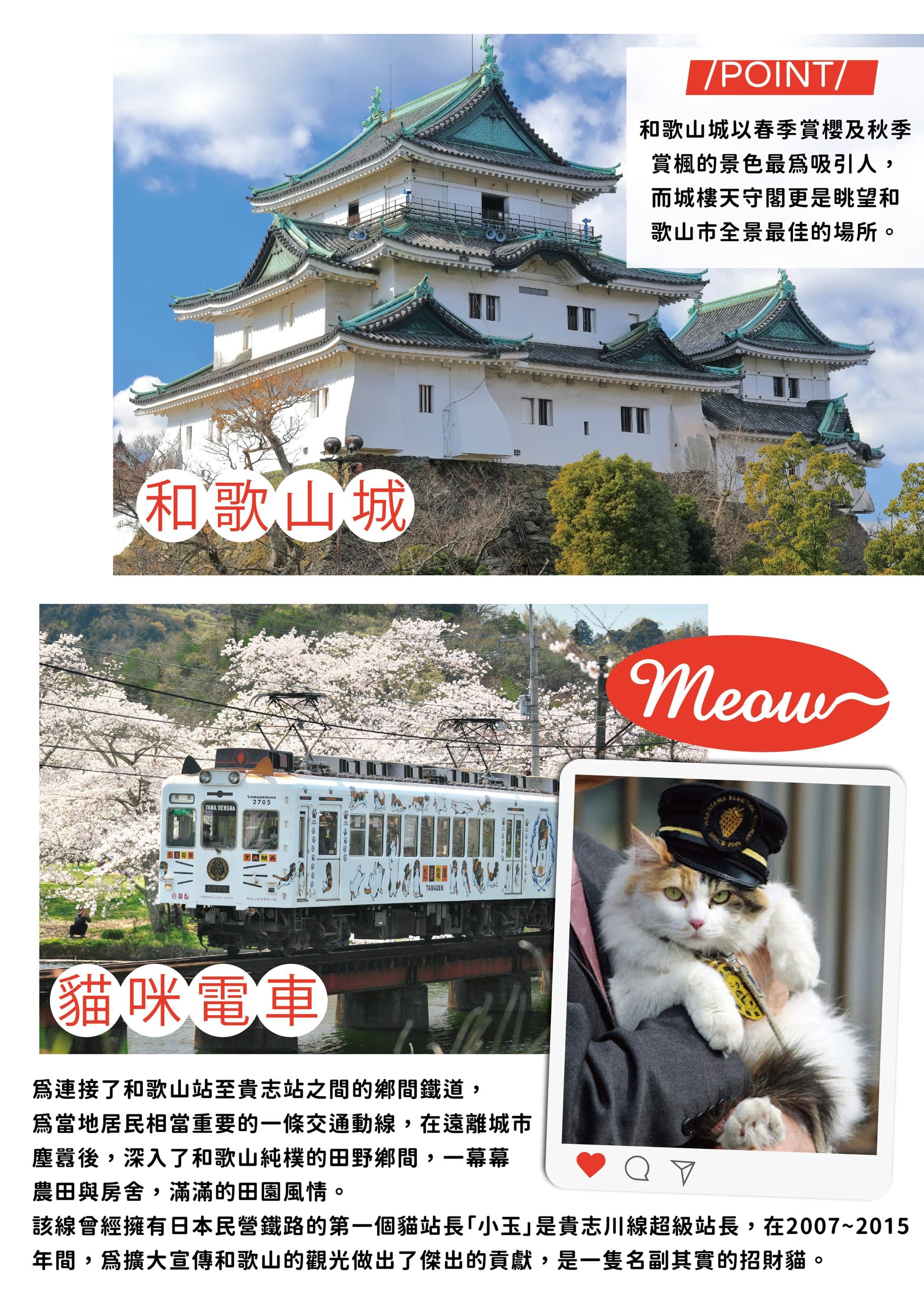 【和歌山電鐵・貴志川線】為連接了和歌山站至貴志站之間的鄉間鐵道,為當地居民相當重要的一條交通動線,在遠離城市塵囂後,深入了和歌山純樸的田野鄉間,一幕幕農田與房舍,滿滿的田園風情。該線曾經擁有日本民營鐵路的第一個貓站長「小玉」是貴志川線超級站長,在2007~2015年間,為擴大宣傳和歌山的觀光做出了傑出的貢獻,是一隻名副其實的招財貓。2015年6月小玉站長過世,由其部下NITAMA接任。