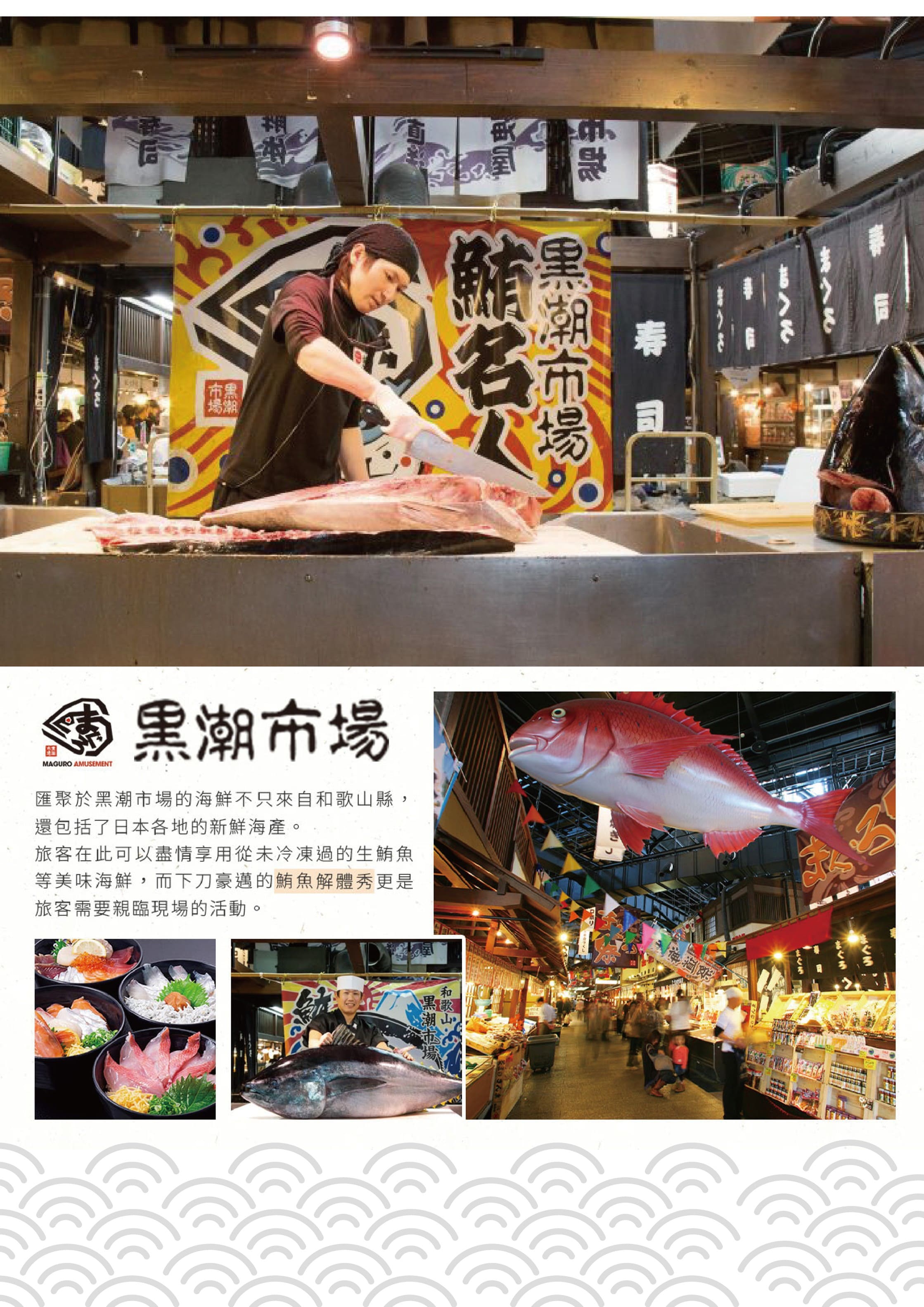【黑潮市場(體驗關西最大海鮮市場)~鮪魚解體秀】位於和歌山縣,最有名的黑潮市場,在這裡可以品嚐到日本最新鮮的魚類,深受許多觀光客的喜愛。除此之外,還有大受注目的鮪魚解體秀,每天舉辦,一天只有三次,11:00~和12:30~和15:00~,精彩的鮪魚解體秀是不容錯過的!還可在此購買新鮮的鮪魚和其他魚貝類的特產,讓您滿載而歸。
