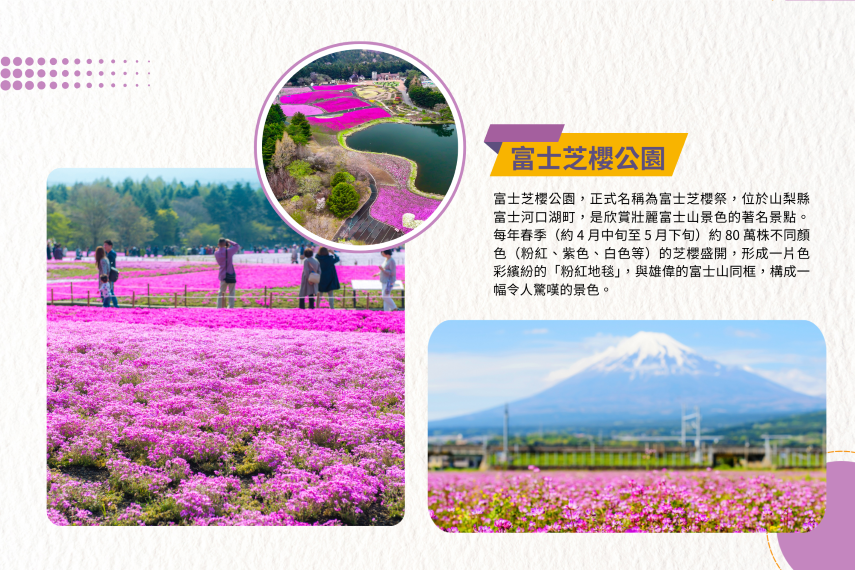 【富士芝櫻公園】富士芝櫻公園,正式名稱為富士芝櫻祭,位於山梨縣富士河口湖町,是欣賞壯麗富士山景色的著名景點。每年春季(約 4 月中旬至 5 月下旬)約 80 萬株不同顏色(粉紅、紫色、白色等)的芝櫻盛開,形成一片色彩繽紛的「粉紅地毯」,與雄偉的富士山同框,構成一幅令人驚嘆的景色。