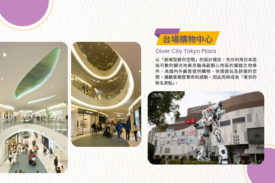 【Diver City Tokyo Plaza(台場購物中心)】以「劇場型都市空間」的設計理念,充分利用日本屈指可數的觀光地東京臨海副都心地區的優越立地條件,為國內外顧客提供購物、休閒遊玩及舒適的空間,讓顧客親歷驚奇和感動,因此而將成為「東京的新名景點」。商場除了集結各種世界知名品牌、國內外的休閒品牌和充滿個性‧獨創性品牌等,各種對時裝潮流敏感的品牌以外,在購物之餘還能夠體驗各種大規模的娛樂設施、東京名店聚集的美食廣場,及盡享餐廳樓層的美食等,是富有多樣性和話題性的商業設施。商場聚集從外國品牌至國內外的休閒品牌、大型SPA品牌(製造商經營型態)等,各種對時裝潮流敏感的品牌。國內最大規模的「ABC-mart」、「H&M」、「UNIQLO」、「BURBERRY BLUE LABEL」的複合店、「COACH」男裝等,眾多的外國專櫃品牌, 以優質合理的價格進駐。特別推薦您:世界首創型娛樂設施「GUNDAM FRONT TOKYO」常設於此,鋼彈迷千萬不可錯過!
