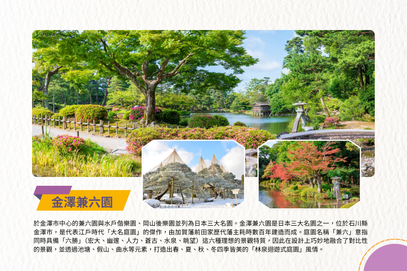 【金澤兼六園】於金澤市中心的兼六園與水戶偕樂園、岡山後樂園並列為日本三大名園。金澤兼六園是日本三大名園之一,位於石川縣金澤市,是代表江戶時代「大名庭園」的傑作,由加賀藩前田家歷代藩主耗時數百年建造而成。庭園名稱「兼六」意指同時具備「六勝」(宏大、幽邃、人力、蒼古、水泉、眺望)這六種理想的景觀特質,因此在設計上巧妙地融合了對比性的景觀,並透過池塘、假山、曲水等元素,打造出春、夏、秋、冬四季皆美的「林泉迴遊式庭園」風情。