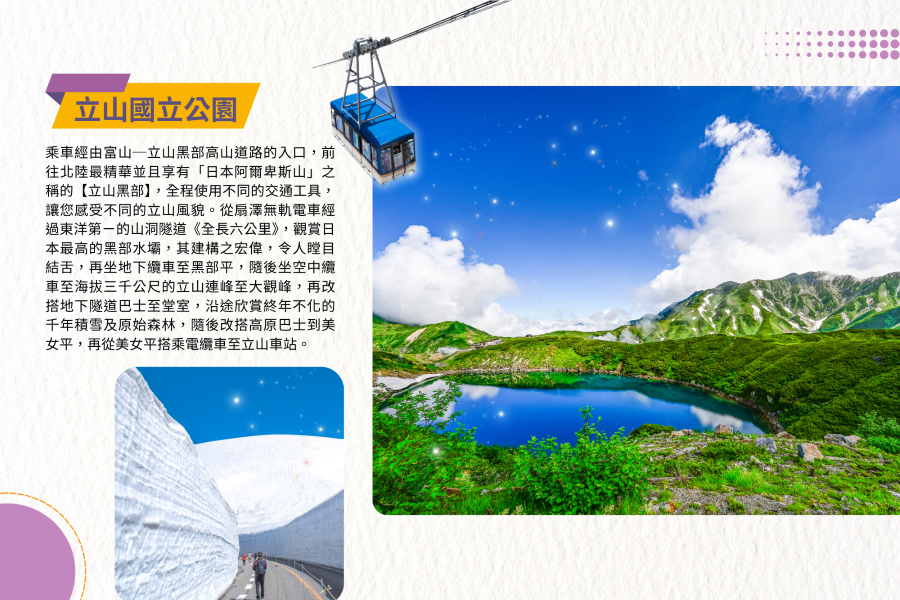 【立山國立公園】乘車經由富山─立山黑部高山道路的入口,前往北陸最精華並且享有「日本阿爾卑斯山」之稱的【立山黑部】,全程使用不同的交通工具,讓您感受不同的立山風貌。從扇澤無軌電車經過東洋第ㄧ的山洞隧道《全長六公里》,觀賞日本最高的黑部水壩,其建構之宏偉,令人瞠目結舌,再坐地下纜車至黑部平,隨後坐空中纜車至海拔三千公尺的立山連峰至大觀峰,再改搭地下隧道巴士至堂室,沿途欣賞終年不化的千年積雪及原始森林,隨後改搭高原巴士到美女平,再從美女平搭乘電纜車至立山車站。