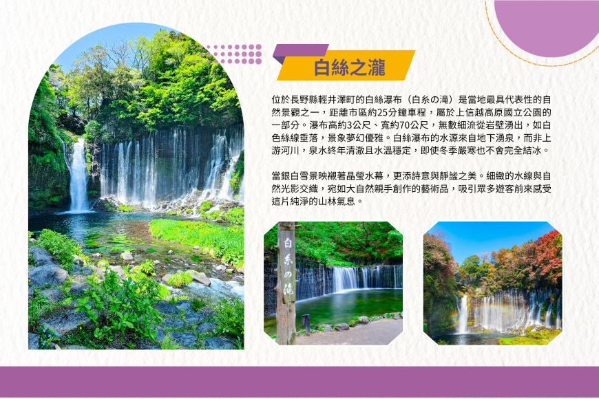 【白絲之瀧】位於長野縣輕井澤町的白絲瀑布(白糸の滝)是當地最具代表性的自然景觀之一,距離市區約25分鐘車程,屬於上信越高原國立公園的一部分。瀑布高約3公尺、寬約70公尺,無數細流從岩壁湧出,如白色絲線垂落,景象夢幻優雅。白絲瀑布的水源來自地下湧泉,而非上游河川,泉水終年清澈且水溫穩定,即使冬季嚴寒也不會完全結冰。當銀白雪景映襯著晶瑩水幕,更添詩意與靜謐之美。細緻的水線與自然光影交織,宛如大自然親手創作的藝術品,吸引眾多遊客前來感受這片純淨的山林氣息。