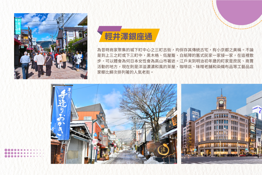 【輕井澤銀座通】輕井澤銀座通是輕井澤歷史悠久的熱鬧購物街,全長約750公尺,充滿歐風情調。這裡匯集了各式各樣的商店,從果醬、手工藝品、在地特色小吃到異國美食餐廳,讓遊客可以盡情購物與品嚐美食。此外,周邊還有舊教堂和雲場池等景點,適合悠閒散步,享受輕井澤的獨特魅力。