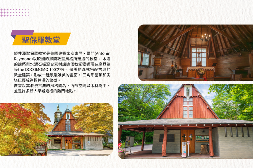 【聖保羅教堂】輕井澤的聖保羅教堂是地標建築,建於1935年,由美國建築師安東尼·雷蒙德(Antonin Raymond)設計。其特色為典雅的三角形屋頂和巨大的尖塔,融合了木造與水泥石板建材。教堂以其浪漫古典的風格聞名,內部空間以木材為主,並是許多新人舉辦婚禮的熱門地點。