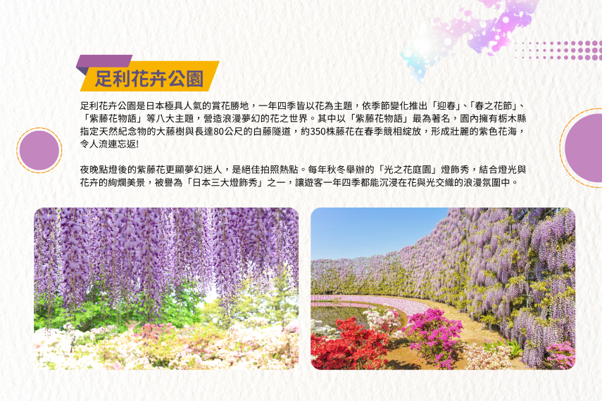 【足利花卉公園】足利花卉公園是日本極具人氣的賞花勝地,一年四季皆以花為主題,依季節變化推出「迎春」、「春之花節」、「紫藤花物語」等八大主題,營造浪漫夢幻的花之世界。其中以「紫藤花物語」最為著名,園內擁有栃木縣指定天然紀念物的大藤樹與長達80公尺的白藤隧道,約350株藤花在春季競相綻放,形成壯麗的紫色花海,令人流連忘返。夜晚點燈後的紫藤花更顯夢幻迷人,是絕佳拍照熱點。每年秋冬舉辦的「光之花庭園」燈飾秀,結合燈光與花卉的絢爛美景,被譽為「日本三大燈飾秀」之一,讓遊客一年四季都能沉浸在花與光交織的浪漫氛圍中。